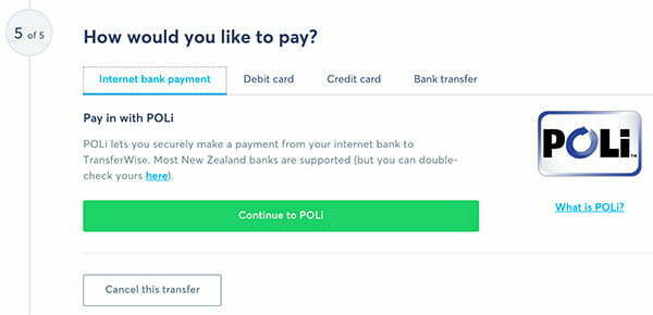 bu ekran goruntusunu baska bir zamanda aldigim icin tarih ve fiyat farkli - Bu adımda para transferi işlemini nasıl yapmak istediğiniz soruluyor. Burada kredi kartı, debit kart, banka transferi gibi seçeneklerin yanında ülkeden ülkeye değişebilecek ekstra transfer seçenekleri de olabiliyor. Ben Yeni Zelanda ve Avustralya’da kullanılan ve güvenilir bir ödeme sistemi olan POLI yi seçip bilgilerimi girmiştim. Siz Bank Transfer kısmını seçip banka hesap bilgilerinizi yazarak da transfer işleminizi yapabilirsiniz.