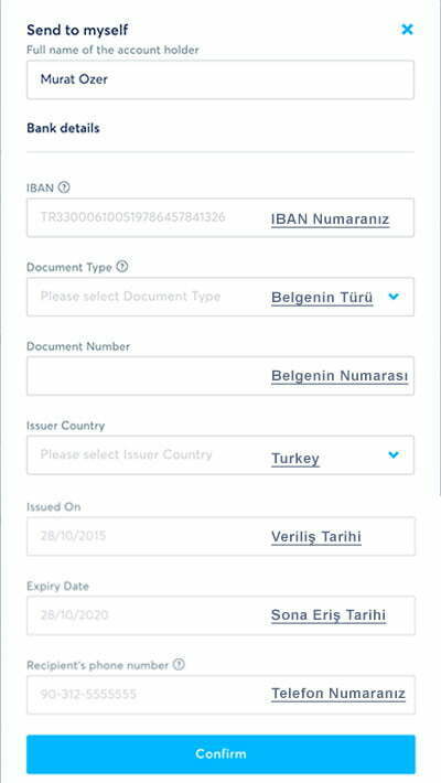 Kendi hesabınıza göndermek için Myself i seçeceksiniz ve ardından gelen ekranda kendi hesap bilgilerinizi gireceksiniz. IBAN Numaranızı yazdıktan sonra, Document Type yazan kısımda 3 farklı belge seçebiliyorsunuz; pasaport, ehliyet ya da kimlik. Ben kendi üyelik işlemimde pasaport seçip pasaport bilgilerimi girmiştim. Vermek istediğiniz belgeyi seçtikten sonra belgenizin numarasını, verildiği ülkeyi ki Türkiye, veriliş tarihi ve sona erme tarihini ve telefon numaranızı yazıyorsunuz. Tüm bunları yazdıktan sonra Confirm butonuna basarak devam ediyorsunuz.